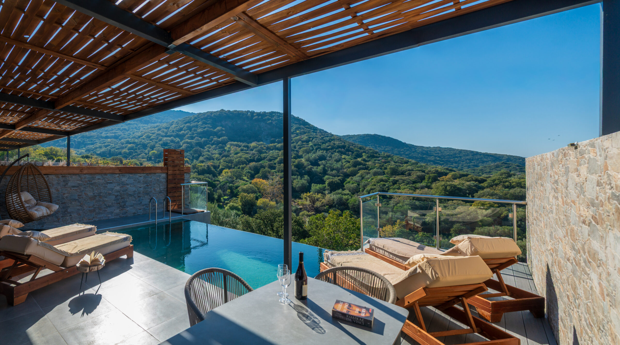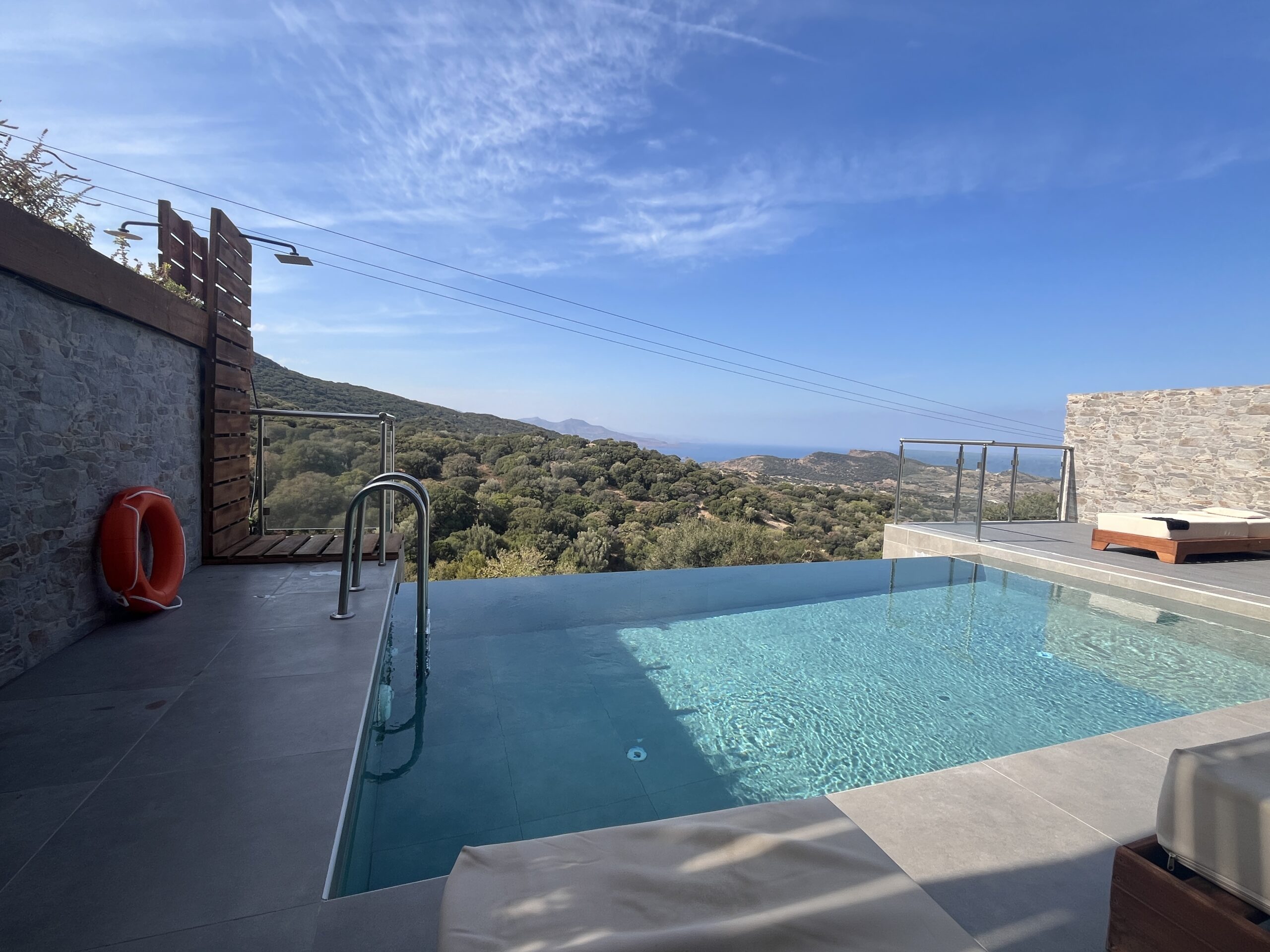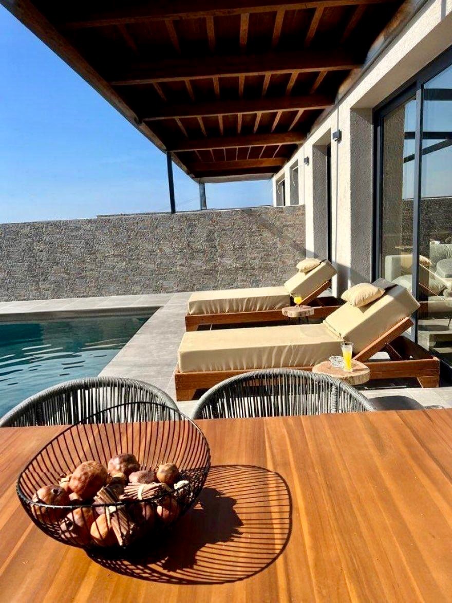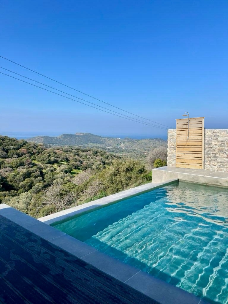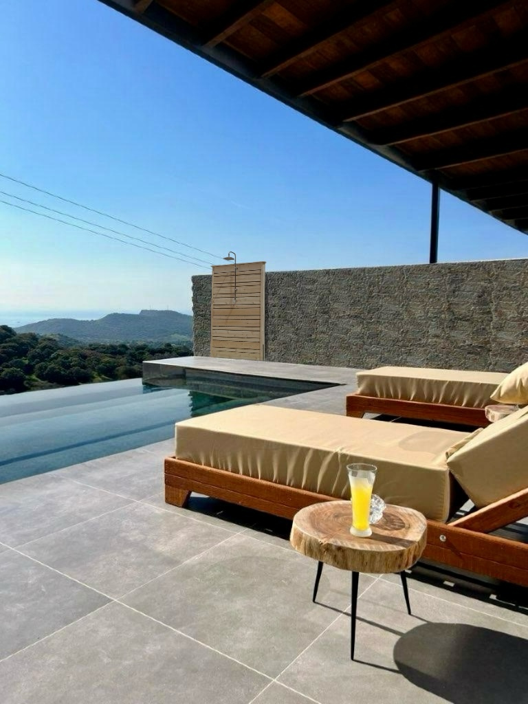 Start dagen med et dyp i din private pool, hvor udsigten strækker sig over bølgende olivenlunde og Det Ægæiske Hav. Terrasserne og balkonerne indbyder til at nyde solen, stille stunder og de farverige solnedgange – et perfekt sted til afslapning og ro.