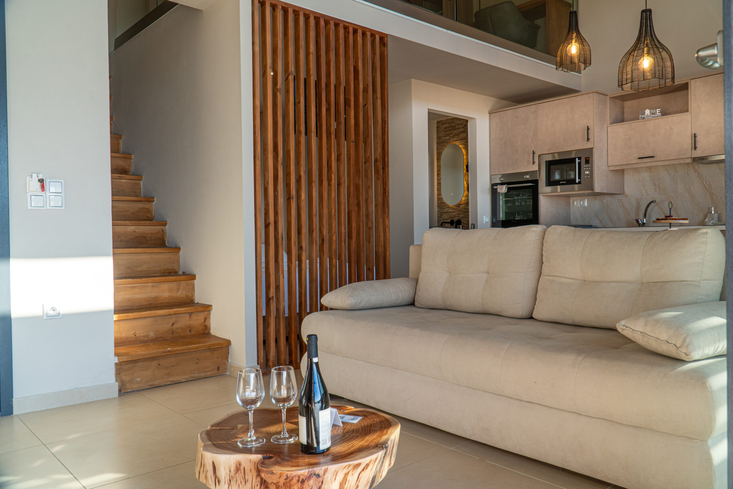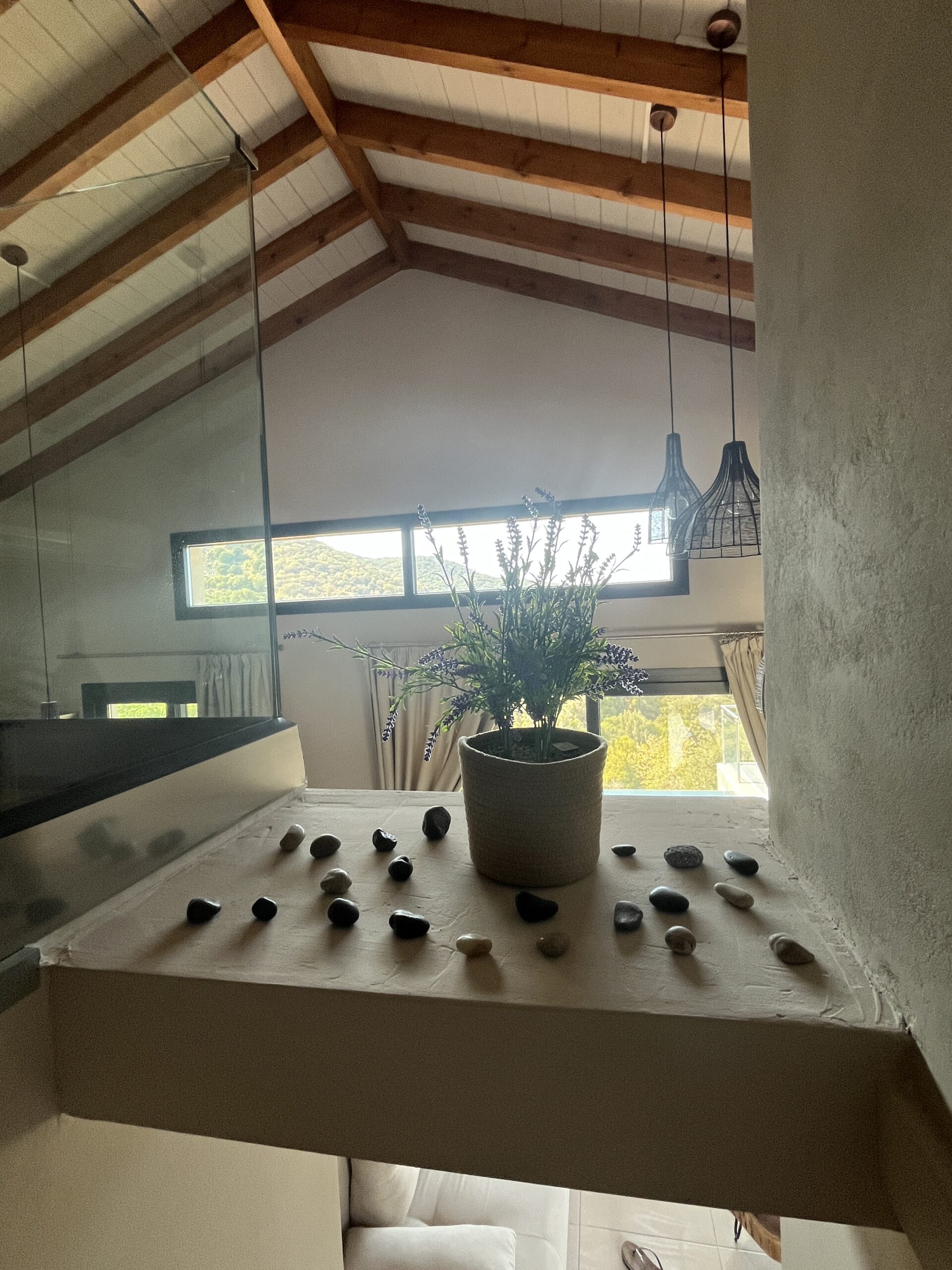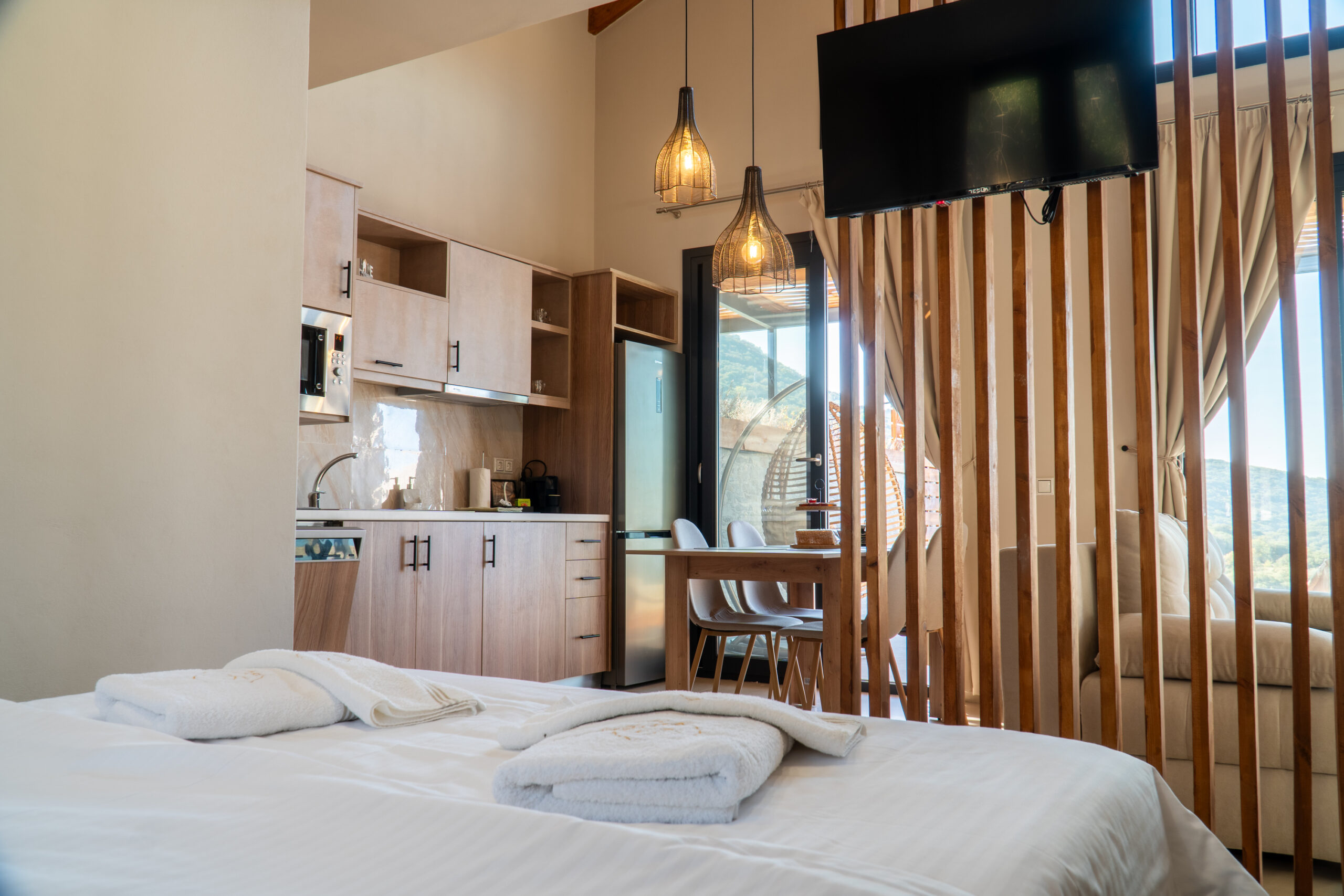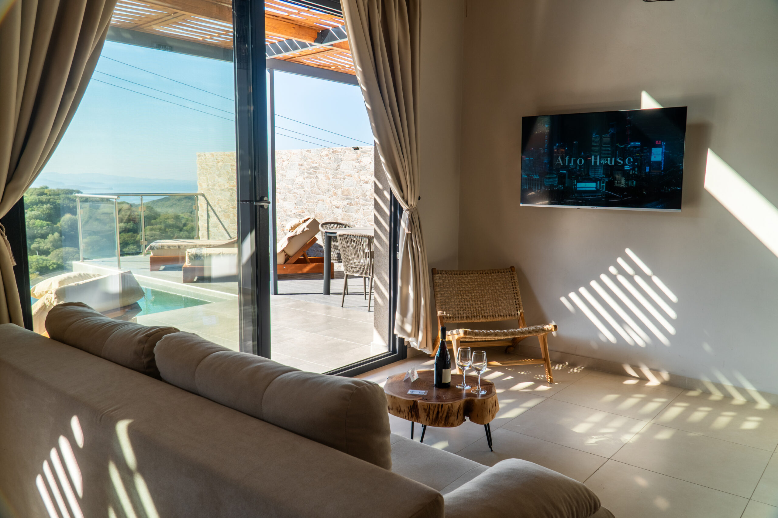 Start dagen med et dyp i din private pool, hvor udsigten strækker sig over bølgende olivenlunde og Det Ægæiske Hav. Terrasserne og balkonerne indbyder til at nyde solen, stille stunder og de farverige solnedgange – et perfekt sted til afslapning og ro.