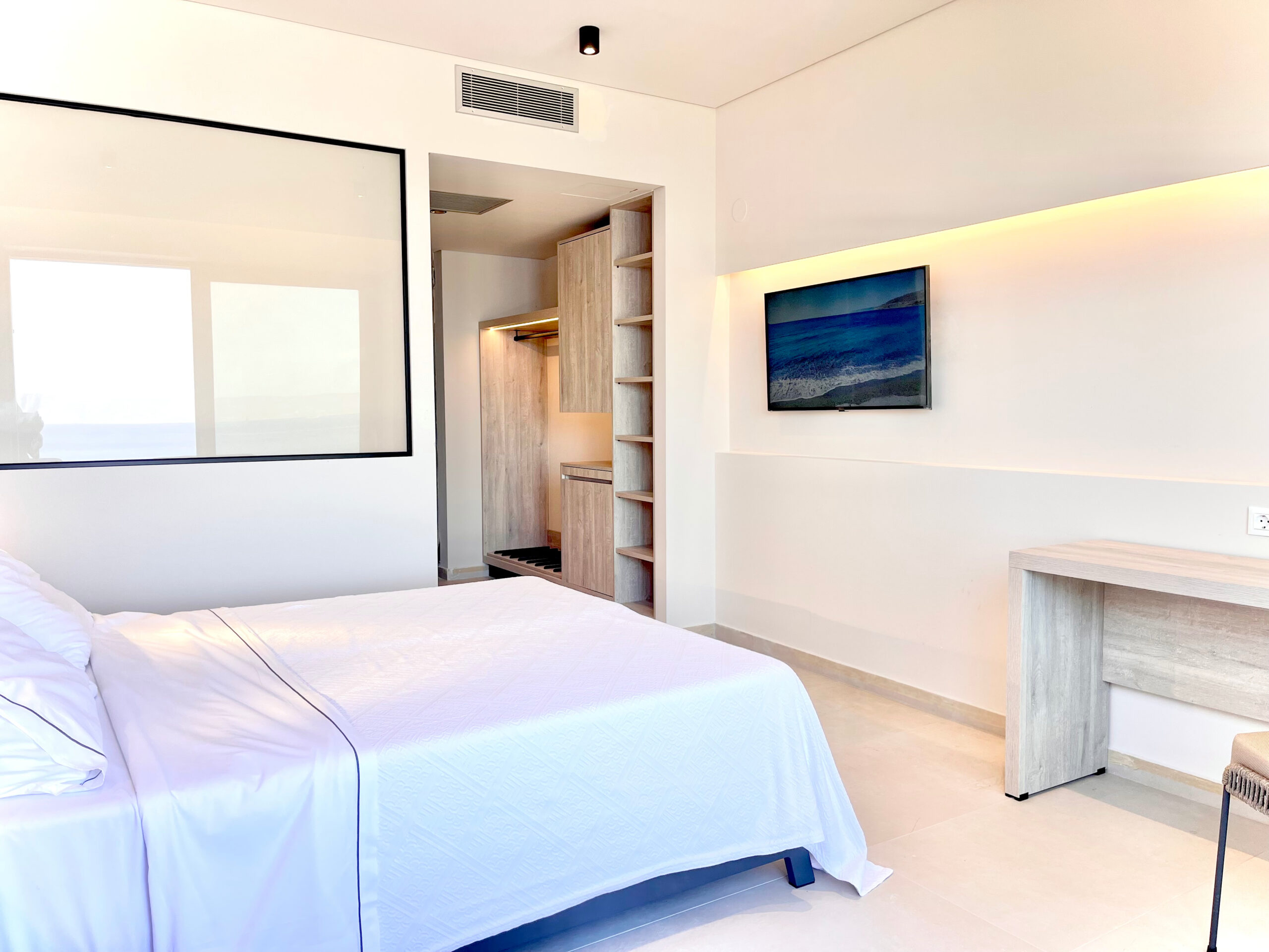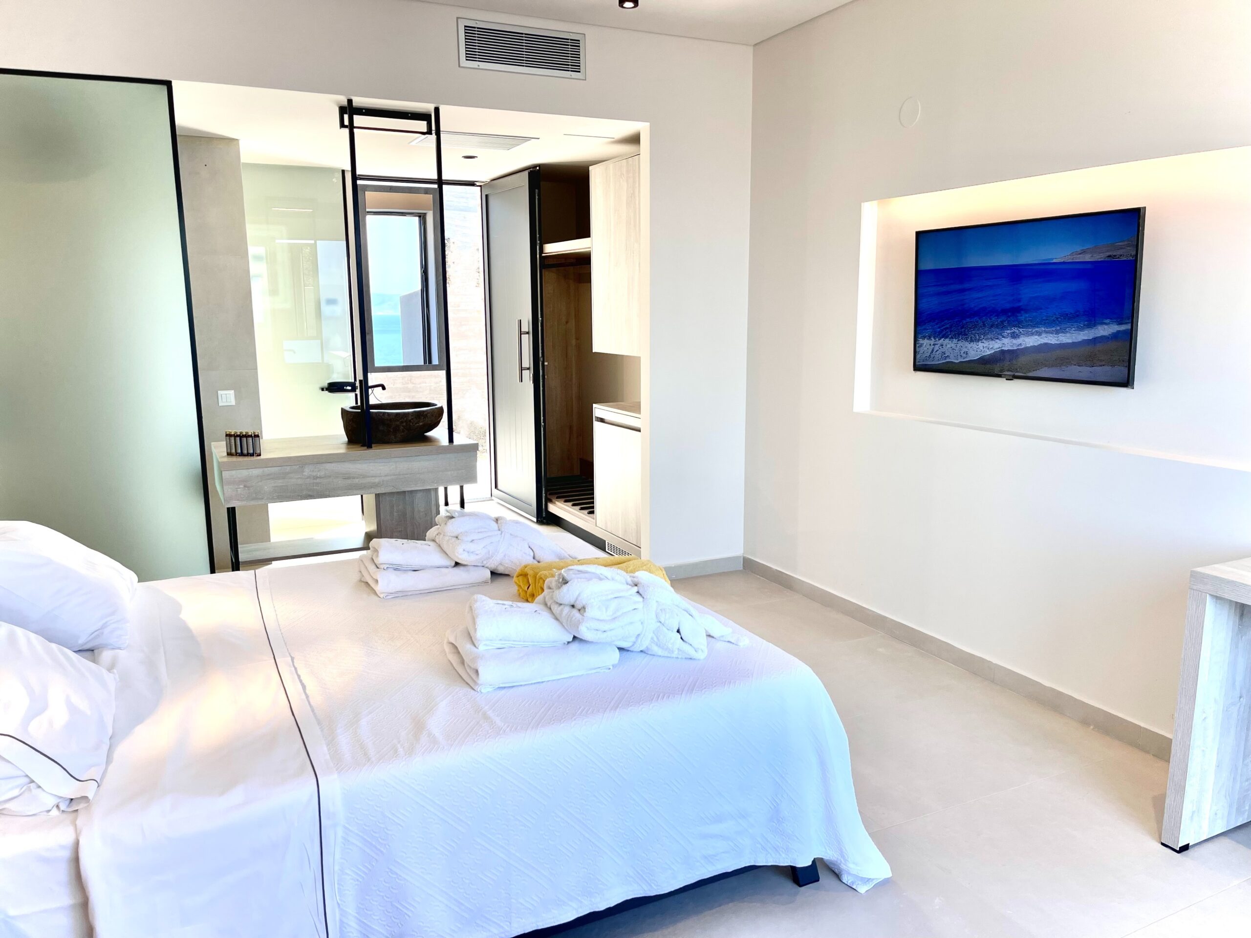 Deluxeværelse på 25 kvm med privat 12 kvm terrasse og 15-20 kvm saltvandspool. Værelset er indrettet i et ekstra eksklusivt open-plan design, hvor soveområde og badeværelse flyder sammen i ét lyst og stilrent rum, mens toilettet er separat og adskilt med dør.