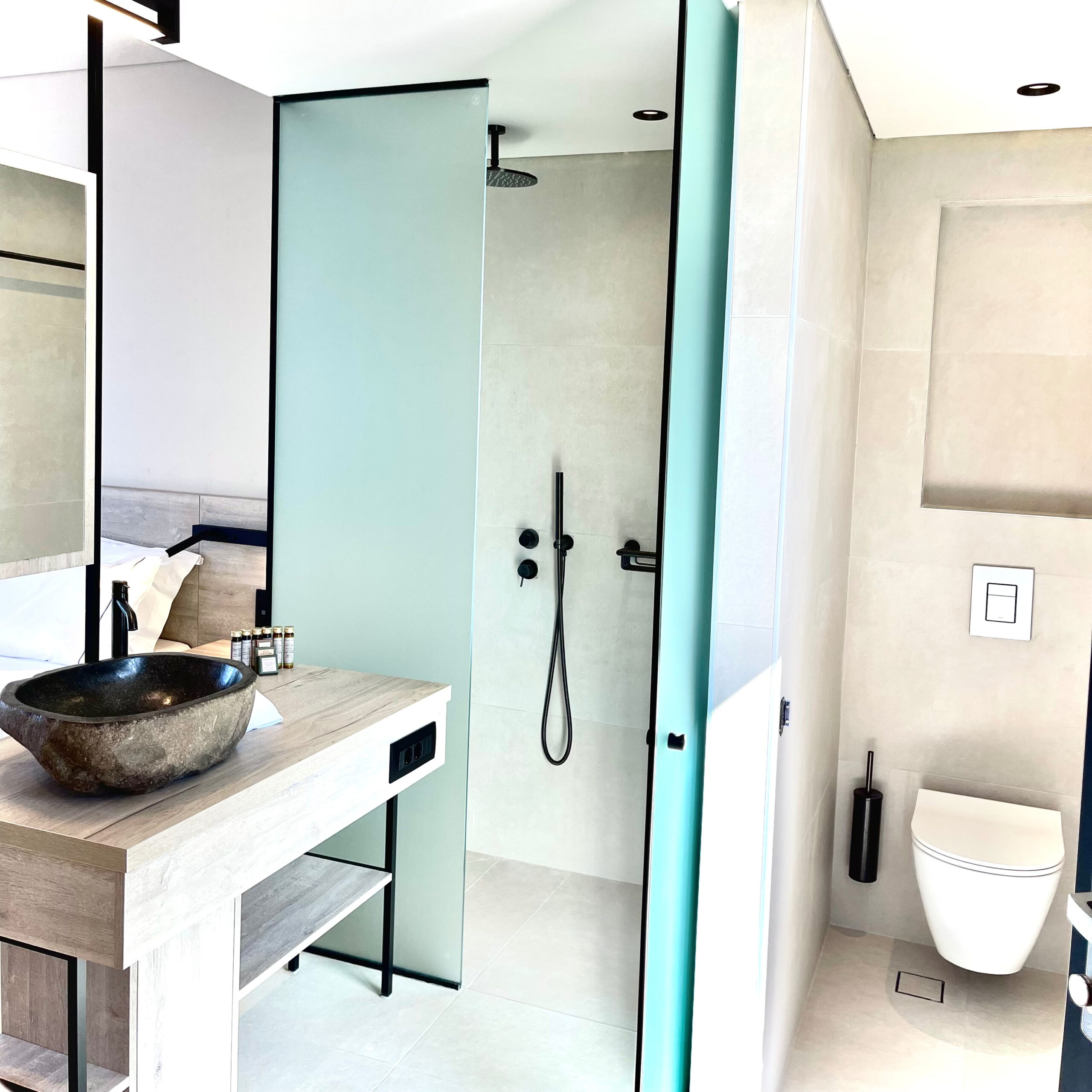 Superiorværelse på 25 kvm med privat 9 kvm terrasse og 11 kvm saltvandspool. Værelset er indrettet i et ekstra eksklusivt open-plan design, hvor soveområde og badeværelse flyder sammen i ét lyst og stilrent rum, mens toilettet er separat og adskilt med dør.