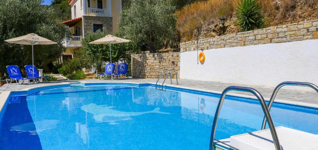 Små veje og stier fører ned til stranden, der ligger få hundrede meter væk, så du let kan kombinere pool liv og strandliv ved det krystalklare Ægæiske Hav. Ved Kerveli strand finder du også et par tavernaer, så du har alt i gåafstand.