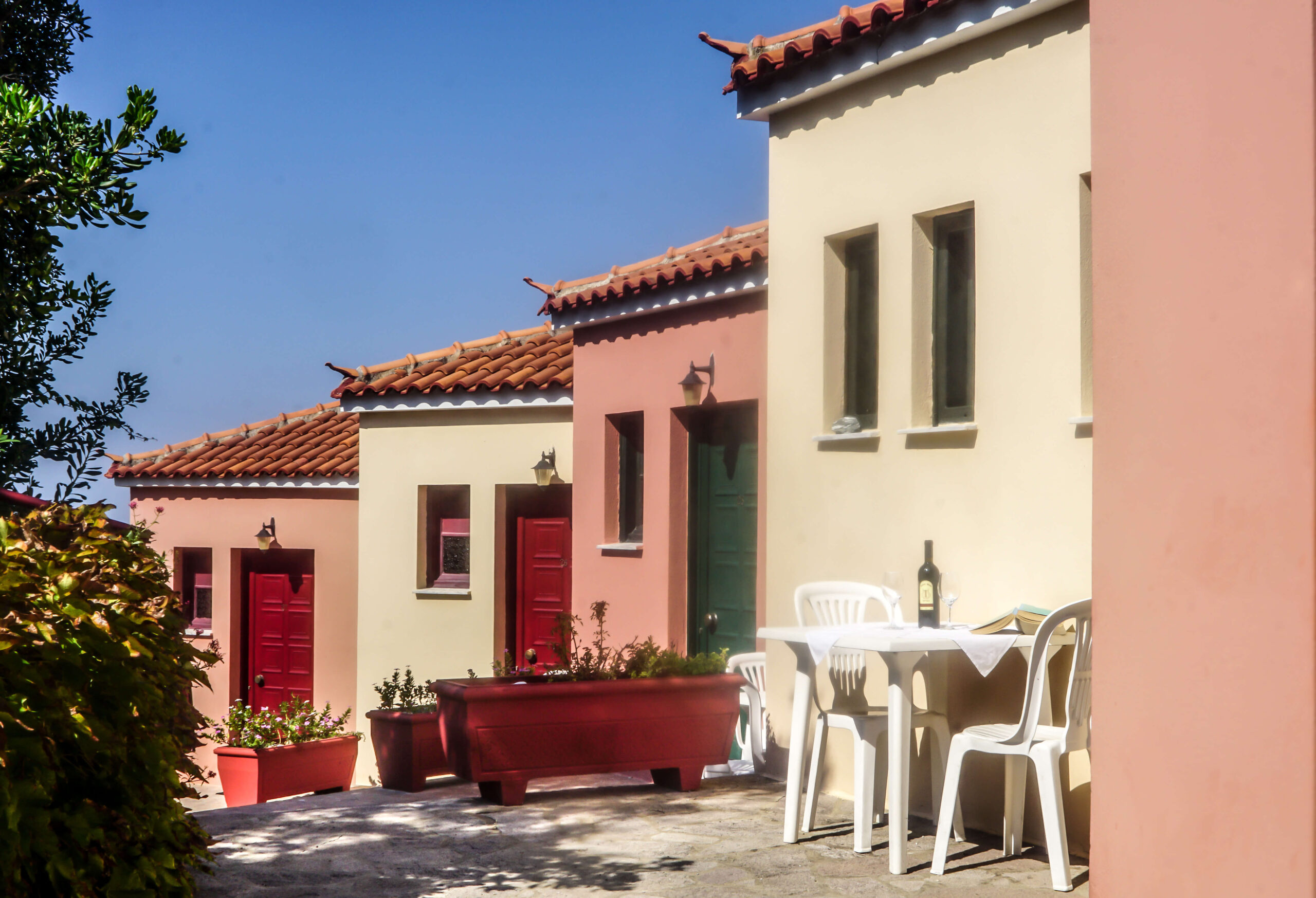 Der er syv komfortable etværelseslejligheder bungalowstil (25 kvm) i græsk stil med private verandaer og betagende udsigt over havet og bjergene. Der er én etværelseslejlighed med terrasse ved indgangen (ikke-privat). Hver lejlighed er indrettet med dobbeltseng eller to enkeltsenge, køkkenkrog med køleskab, moderne badeværelse med bruser, aircondition og gratis WiFi.