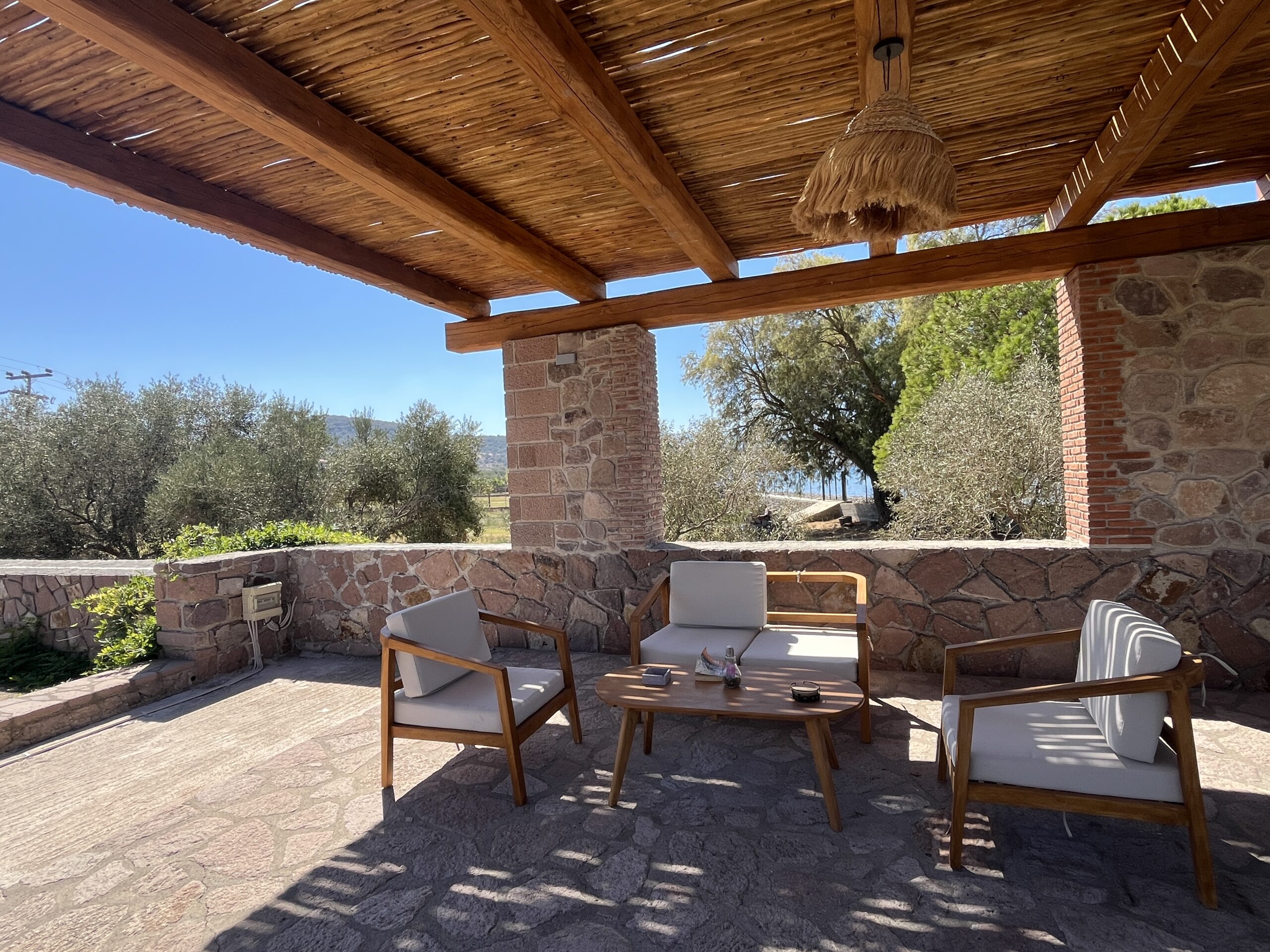 Der er én stor og rummelig toværelseslejlighed med to soveværelser, fuldt udstyret køkken, badeværelse med badekar og to private terrasser – én med havudsigt og én stor, skyggefuld terrasse med udsigt over bjergsiden. De høje trælofter skaber en moderne, men stadig traditionel atmosfære, og alle faciliteter er designet til at gøre opholdet afslappende og behageligt for hele familien eller grupper.